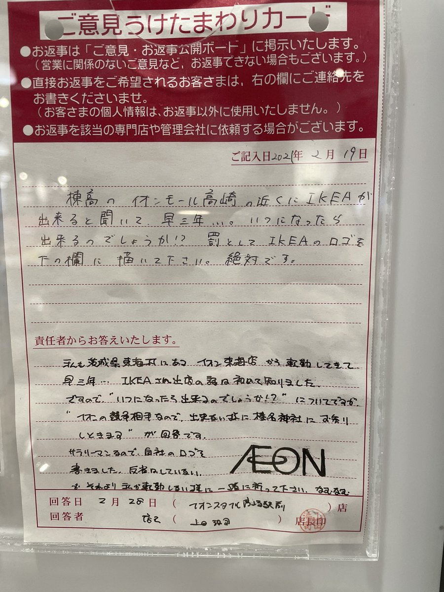 高崎駅前のイオンでは ご意見うけたまわりカード にキレッキレの返信をする店長がいるらしい 本当に責任者 店長 なの草 togetter