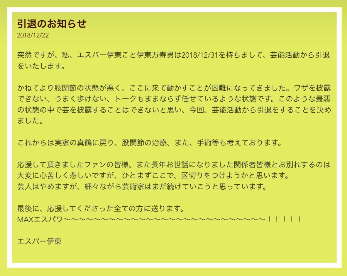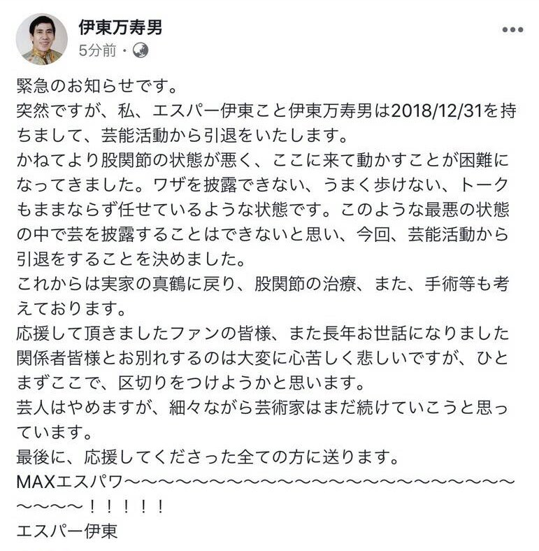 エスパー伊東さんが芸能活動から引退を発表 togetter