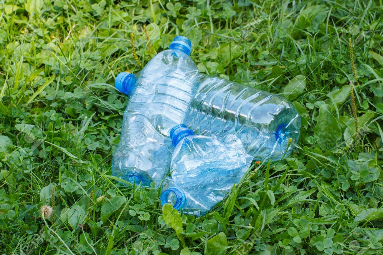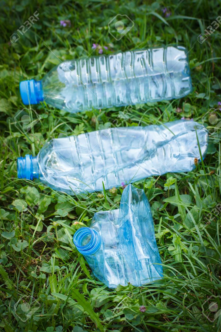 環境保護の概念 公園の芝生の上のミネラルウォーターのペットボトルを破砕環境のポイ捨て