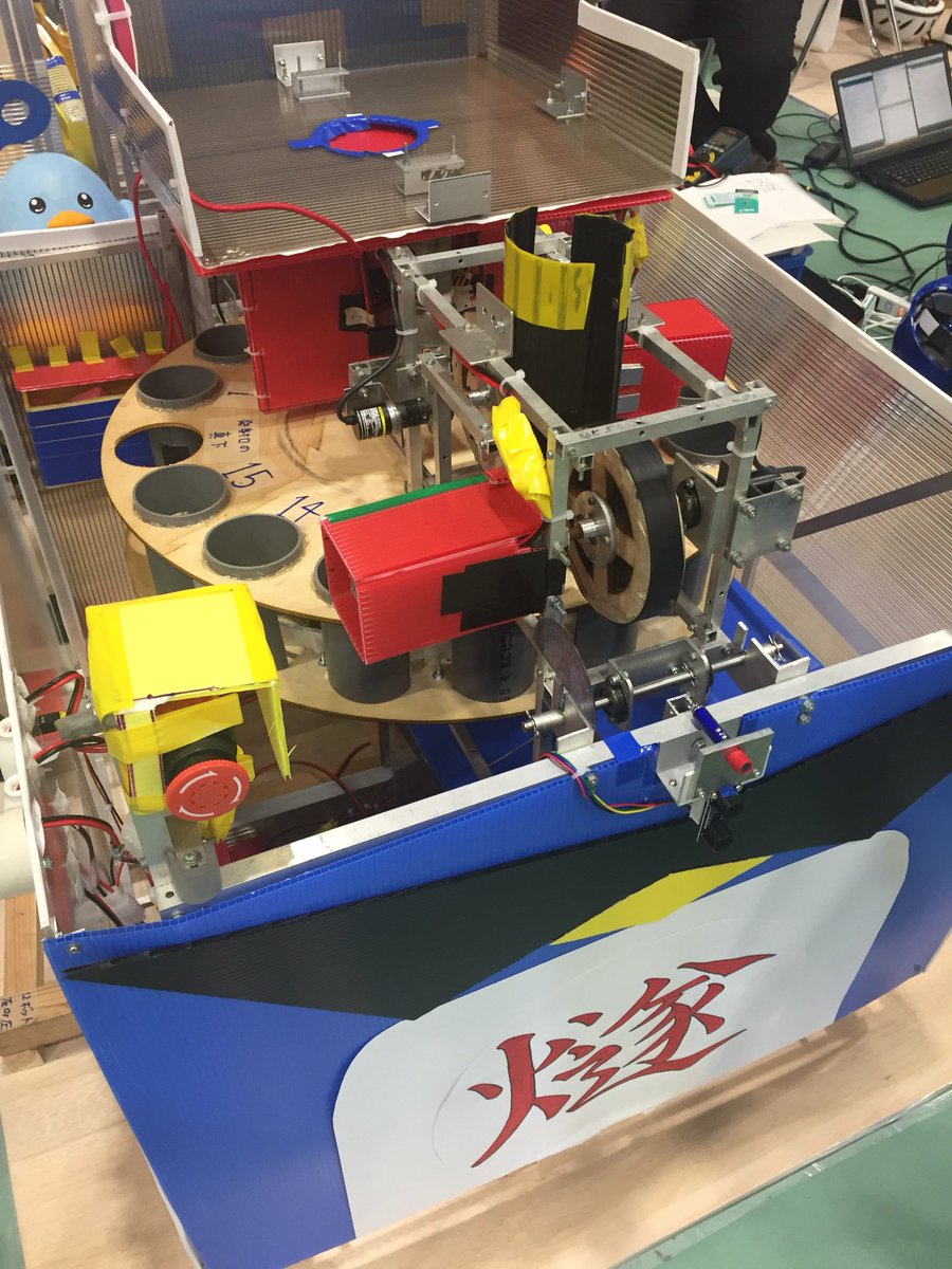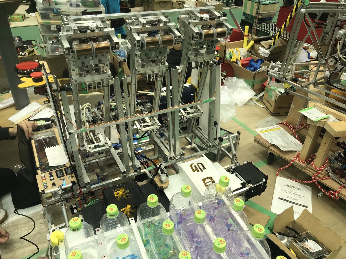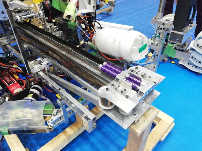 府立大学高専ろぼっと倶楽部 auf twitter 今年の機体紹介します bチームの自動マシンです 機械設計 回路 プログラム全て2年生だけで製作しました 装飾担当は1年生で スー 定荷重ばねで2段テーブル下段と移動テーブル3つにペットボトルを立たせることが出来