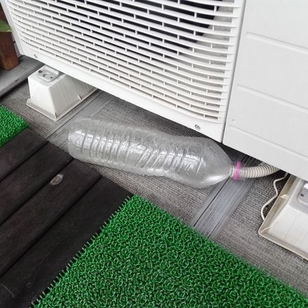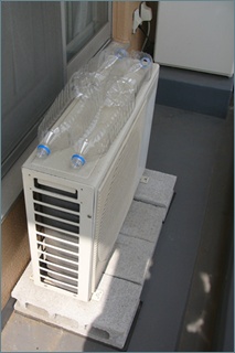 着物十番 on twitter エアコン室外機の熱中症対策 ペットボトルに針で穴 透水タイルを敷く 透水タイルが適度に水を保持 気化熱でジワジワ冷やす だいたい2リットルペットボトルで長いと2時間くらい水撒き続けます 気温35 とかで全く効かなくなるエアコンが動く