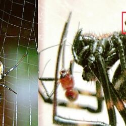 上がオスで 下の大きい方がメス クモはほとんどの種類が オスとメスの大小の差が極端 オスは自分の巣を張らず メスの巣に居候して暮らしている 写真 西日本新聞me